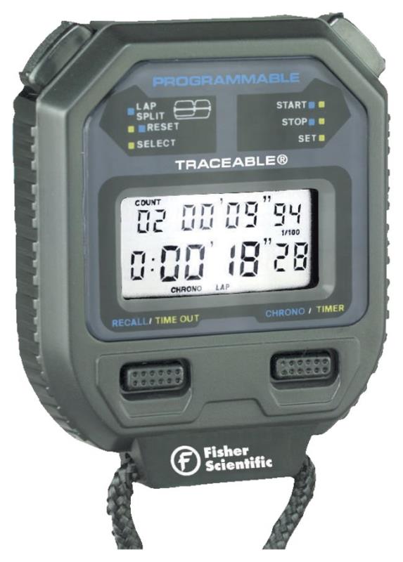 DescriptionIdeal for an analysis that must be noted at routine intervals. Fisher Scientific? Traceable? Stopwatch/Repeat Timer provides stopwatch functions of single-action, time-in/-out, cumulative-split, interval-split, eight memories, and continuous timing. Set countdown time from 10 hours to 1/10 of a second. When zero is reached, timer alarms and repeats countdown from the programmed time. Repeat cycle automatically continues until stopped. Display count box shows how many times the cycle has been repeated. LCD screen continually displays time remaining to zero.